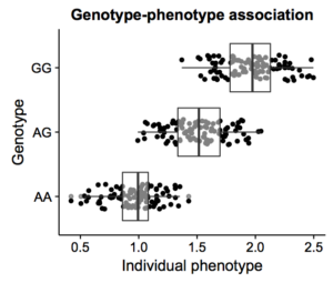 Figure 1. An example of a “candidate gene” experiment testing whether different diploid genotypes are associated with different trait values, or phenotypes. Points are the phenotypes of individual trees, grouped by their diploid genotypes at a candidate gene; overlaid box plots show that trees with different genotypes differ strongly in their phenotypes. (jby)