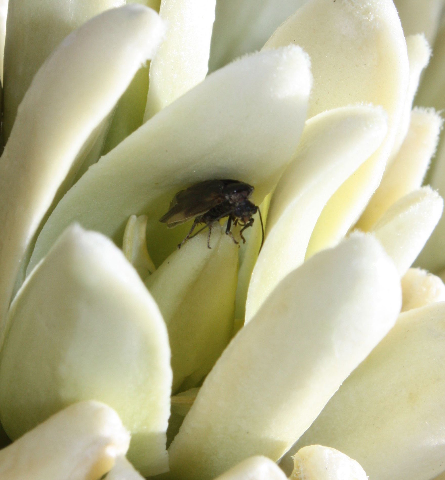 Joshua trees are a critical part of Mojave Desert ecosystems, providing food and habitat for many other living things. Dozens of species of birds nest in the Joshua tree, and the desert night lizard lives in the trees’ fallen branches. Innumerable animals feed on Joshua tree flowers, fruit, and seeds. However, the most remarkable denizens of the Joshua tree are tiny insects called yucca moths. Joshua trees produce no nectar, and very little pollen. They rely on the yucca moths for pollination. The moths collect pollen using unique, tentacle-like moth parts, and then actively pollinate the trees, using their feet and tentacles to deliberately pack pollen into the receptive part of the flower. The moths lay their eggs in the flowers, and when those eggs hatch into caterpillars, they eat some of the Joshua tree’s seeds. So, in exchange for very reliable and efficient pollination, the trees sacrifice a portion of their seeds to the moth’s larvae. Charles Darwin called this remarkable relationship “the most wonderful case of fertilisation ever described.”